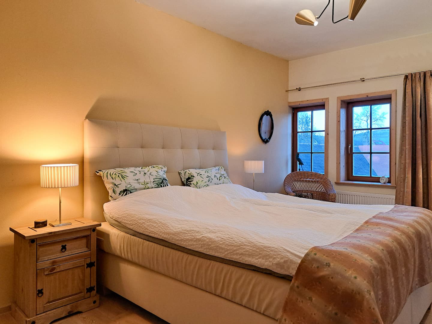 Unsere gemütliche 55 m² große Ferienwohnung „von Berlepsch“ befindet sich im Dachgeschoss des Schloßes und verbindet historischen Charme mit modernem Komfort. Sie bietet eine gut ausgestattete Wohnküche mit Sitzecke, ein separates Schlafzimmer mit gemütlichem 2,20m langem Bett sowie Platz für ein zusätzliches Kinderbett – ideal für Paare oder kleine Familien. Die geschickte Raumaufteilung macht sie zu einem angenehmen Rückzugsort nach einem erlebnisreichen Tag.